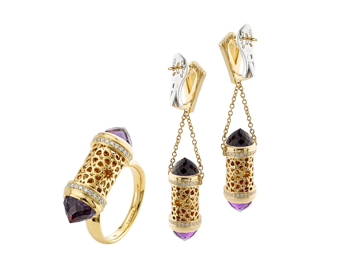 The Flashlight technology is based on the interaction between masterfully cut gemstones and an openwork metal structure. Light, captured by the transparent facets, multiplies within the internal volume and flows outward through the finest ornament, creating an effect of inner radiance. The jewellery becomes not merely a reflector, but an independent source of light. The Flashlight technology is applied in the MINARA collection.