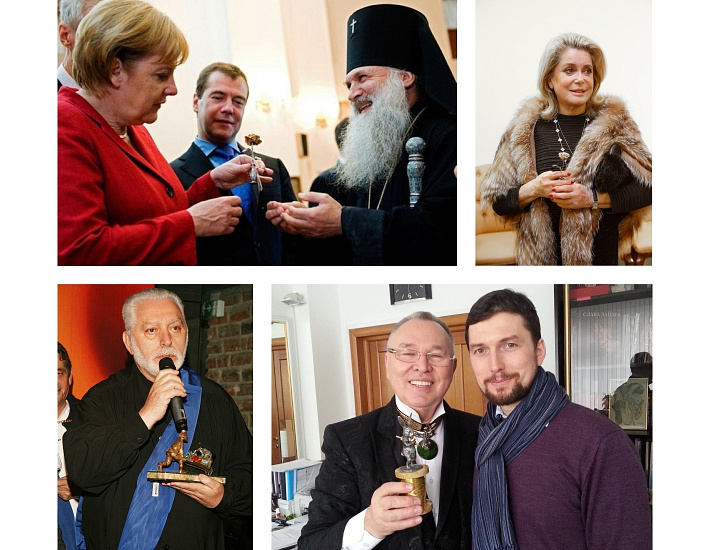 Owners of MOISEIKIN creations include Russian President Vladimir Putin, Queen Elizabeth II of the United Kingdom, Prince Michael of Kent, German Chancellor Angela Merkel, actresses Catherine Deneuve and Zhang Ziyi, Princess Sirivannavari Nariratana of Thailand, and many other contemporary leaders and distinguished figures from the world of art.